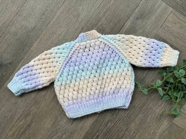 A beautiful hand knitted cardigan waiting to be personalised