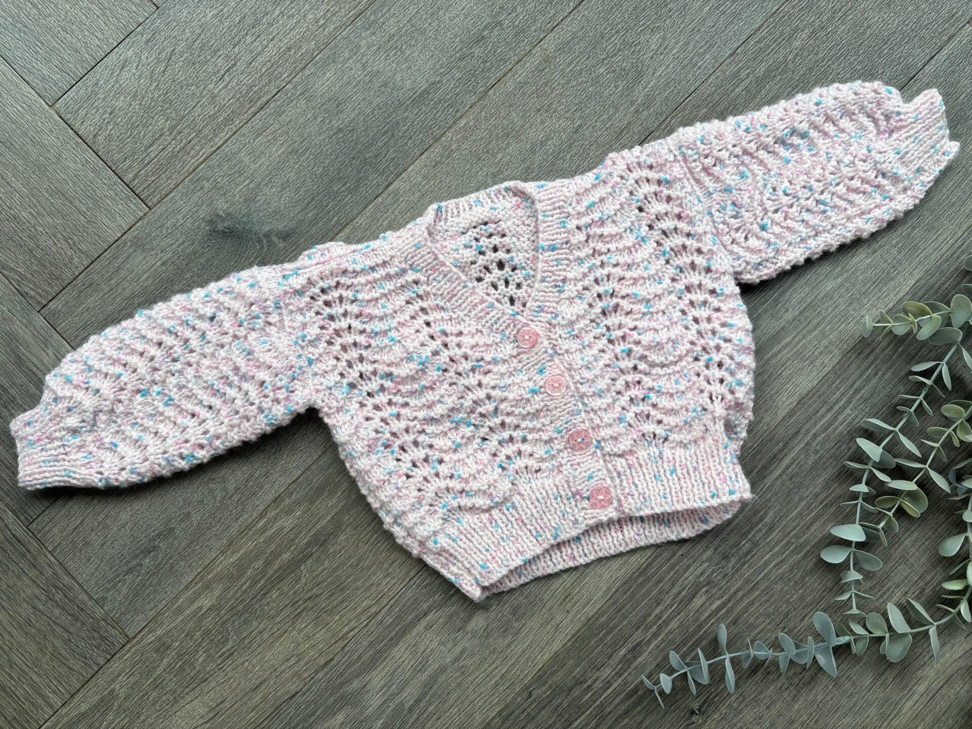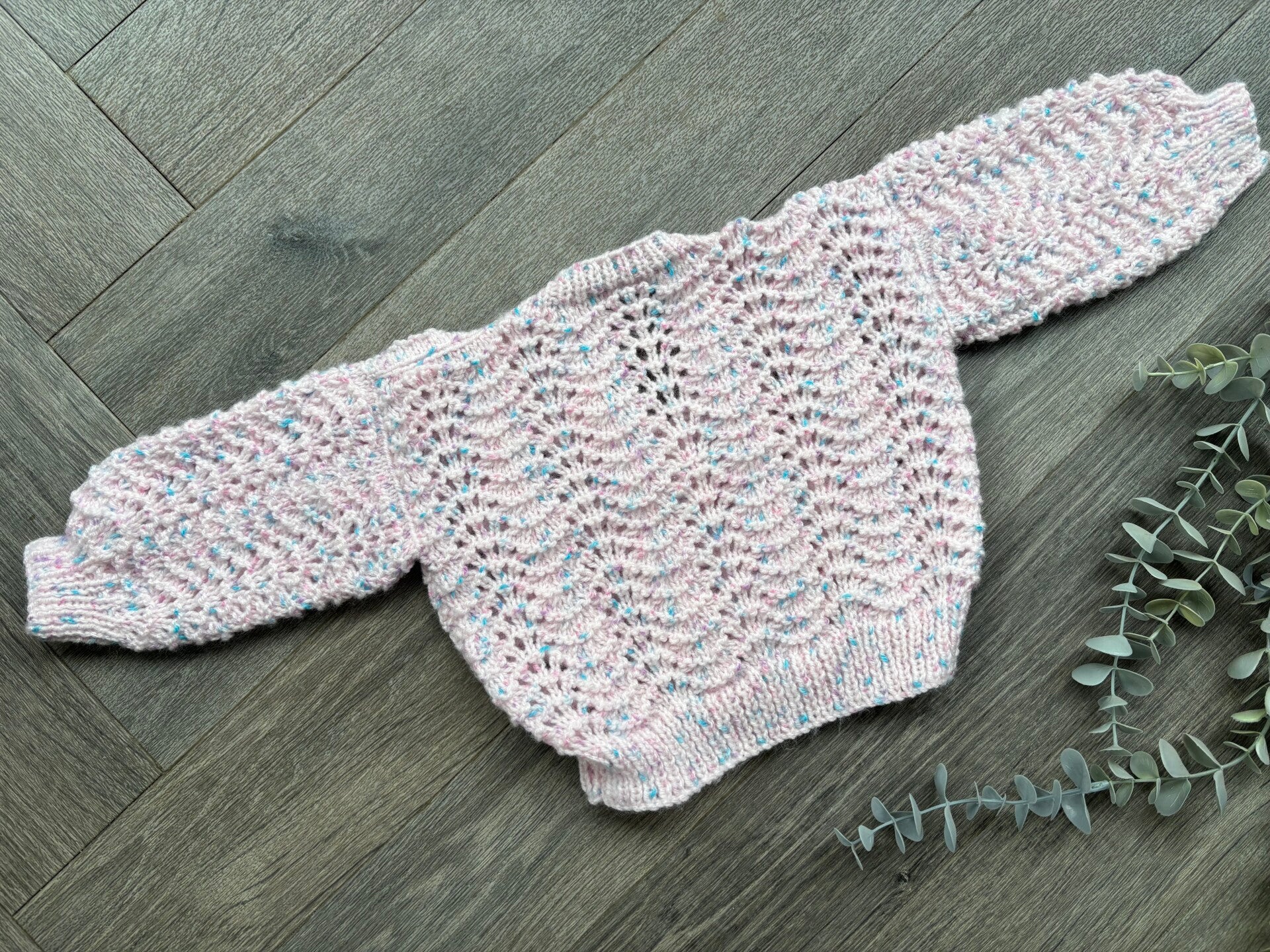 A beautiful hand knitted cardigan waiting to be personalised