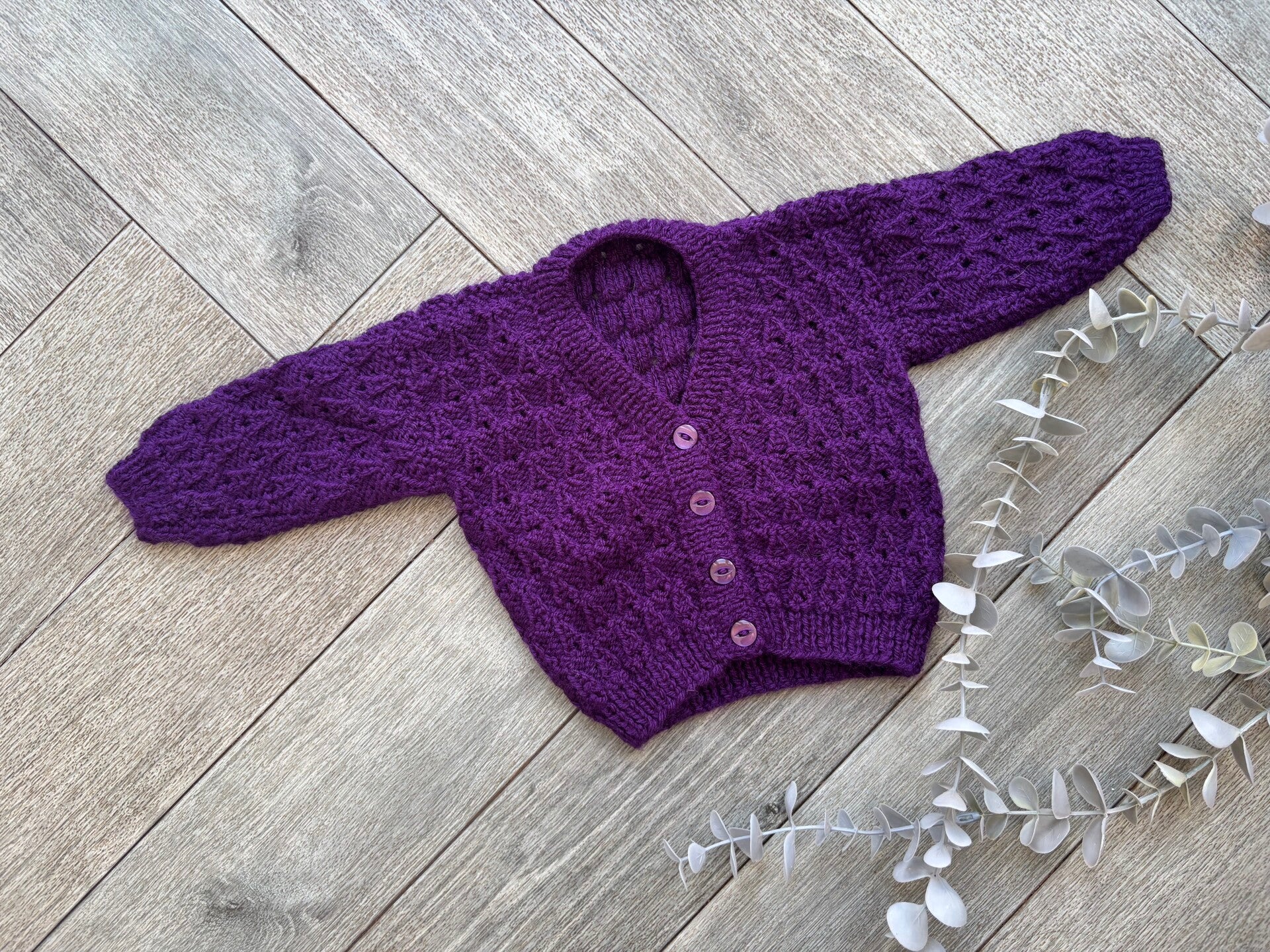 A beautiful hand knitted cardigan waiting to be personalised